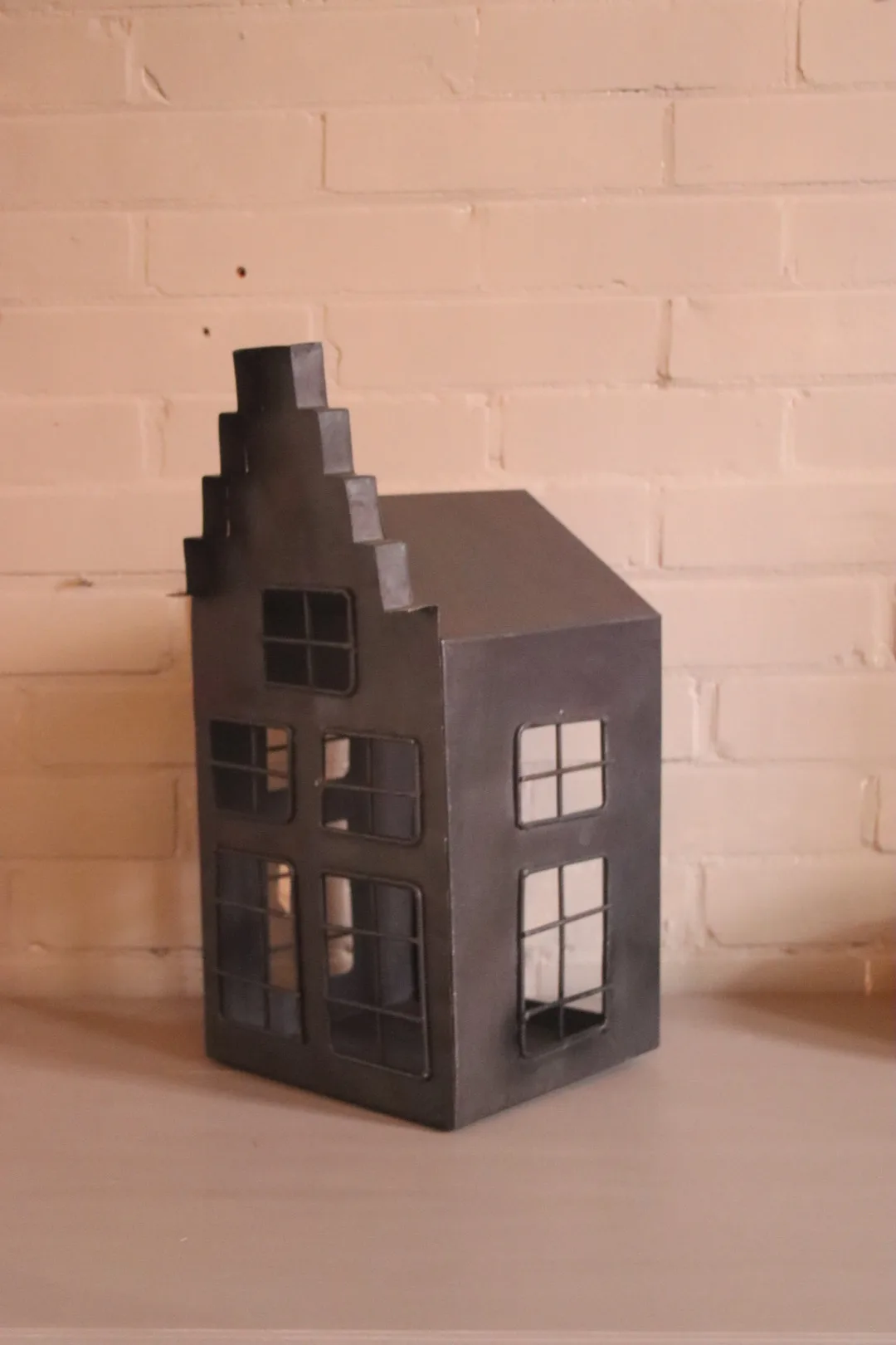 Stoere metalen trapgevel huis waar je een (led) waxinelichtje, kaarsje of draadverlichting in kan doen voor een super cosy effect.